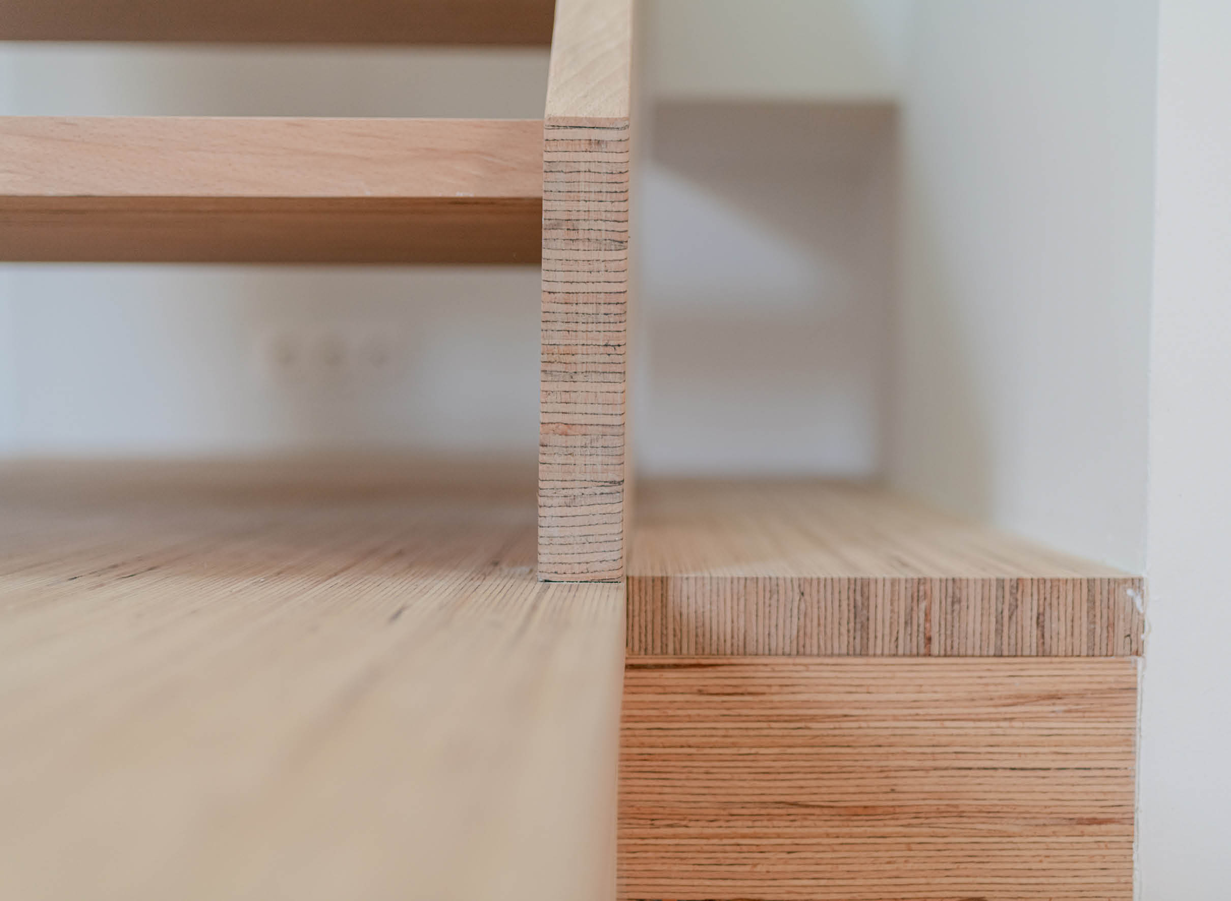 Plus qu’un simple escalier, ce mobilier en bois propose plusieurs fonctions et différentes orientations. Les 3 premières marches, accessibles depuis l’entrée et la cuisine, sont sculptées dans un socle dont le volume constitue un espace de rangement côté salon. C’est sur cette solide estrade que vient se poser délicatement une volée de marches, tenue par de fins et réguliers tasseaux de hêtres. Les stries de bois qu’affiche le baubuche, mêlées aux lignes obliques du limon et du garde-corps, rythment l’objet, diffusent le regard et cadencent la lumière. Les multiples usages, eux, permettent la convergence des flux. En effet, c’est autour de ce mobilier que se déploient toutes les pièces de l’appartement.