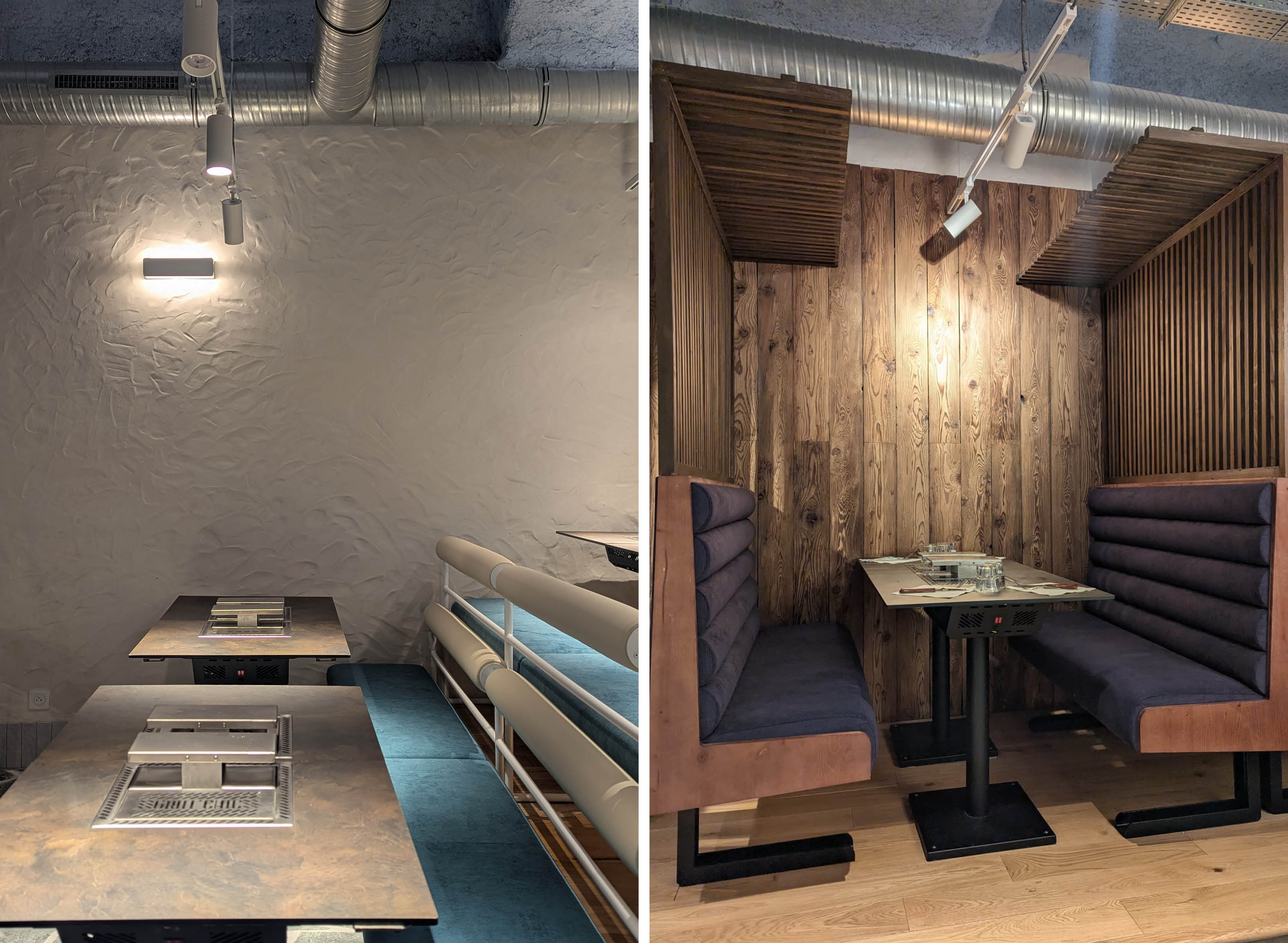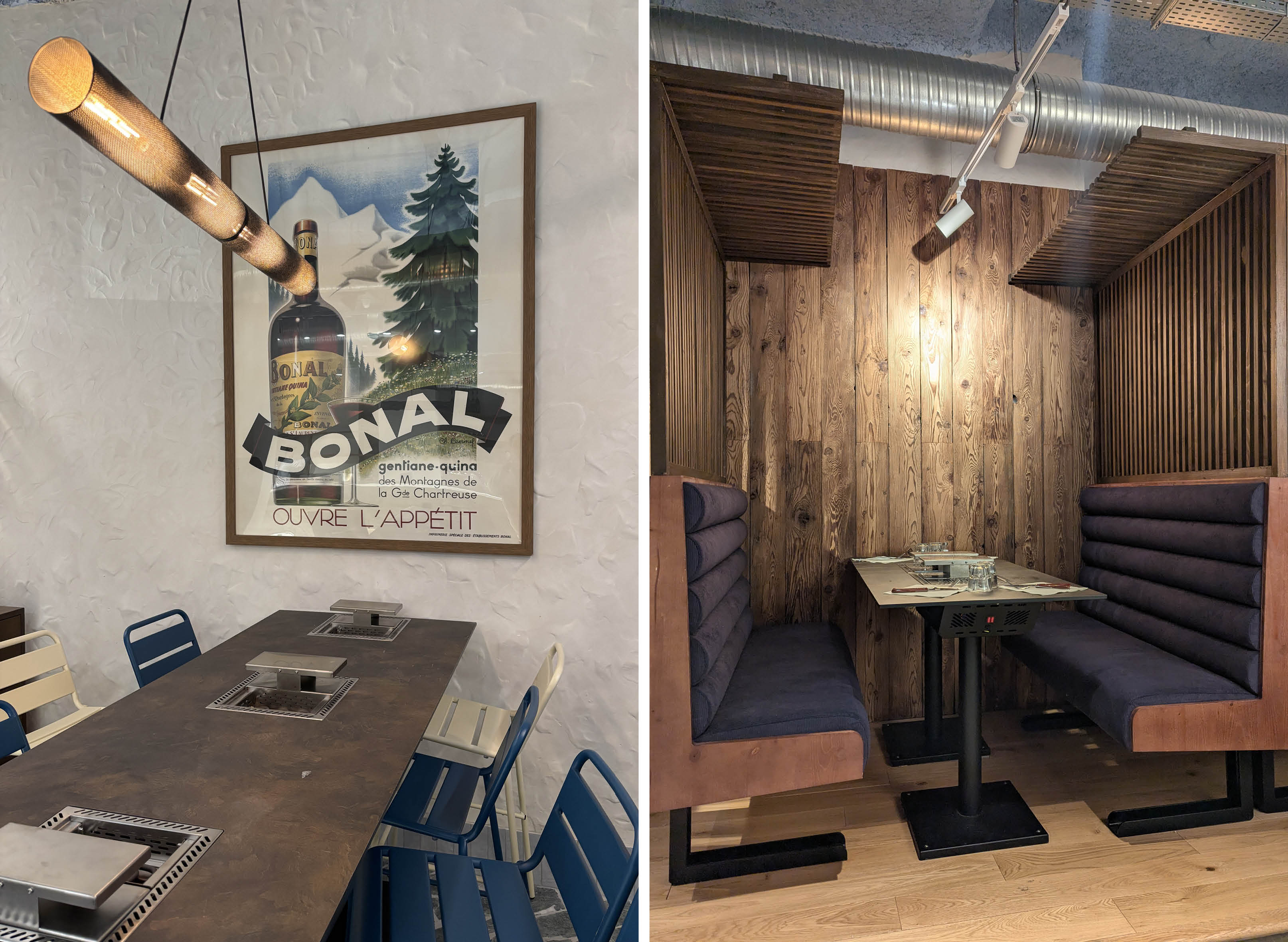 L’espace a été pensé comme une séquence sensorielle, où l’on passe de l’intimité des alcôves en bois à l’ouverture de l’espace « Grand Air », traité comme un extérieur. Les banquettes inspirées des télésièges et le bleu ciel au plafond rappellent les paysages alpins, tandis que les éléments techniques laissés visibles comme la climatisation, électricité, ventilation s'intègrent naturellement dans l’ensemble, à l’image des remontées mécaniques qui s’imposent aux paysages.