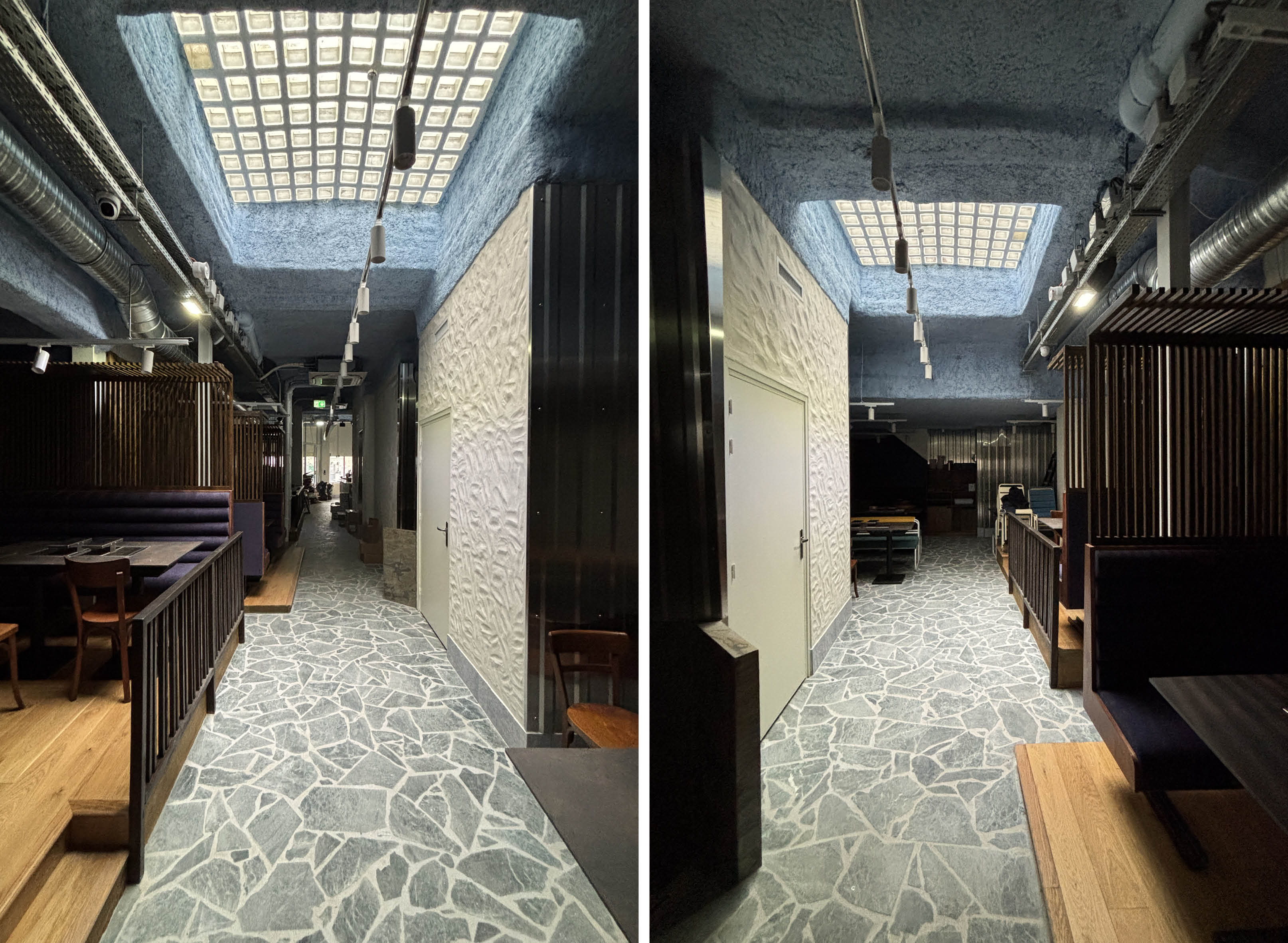 Les Fondus de la Raclette, installé en plein quartier de l’Opéra, ne se limite pas à un simple restaurant : c’est une immersion dans l’univers montagnard, à travers sa robustesse et ses contrastes, une expérience client sensible et vibrante. À partir d’un local étroit, sombre et marqué par une accumulation de travaux successifs, le défi était double : mettre aux normes cet espace vétuste tout en y insufflant l’âme des Alpes. Le concept s’articule autour de la désaisonnalité et de l'évocation de la montagne sous toutes ses dimensions : été et hiver, soleil et neige, roche et végétal, intérieur et extérieur. Chaque matériau a été choisi pour raconter une histoire : le bardage en bois de mélèze et le marbre vert du sol proviennent directement des Alpes et inscrivent visuellement les codes de la région, les bardages en inox s’inspirent des refuges de hautes montagnes, et l’enduit blanc texturé évoque quant à lui la neige.
