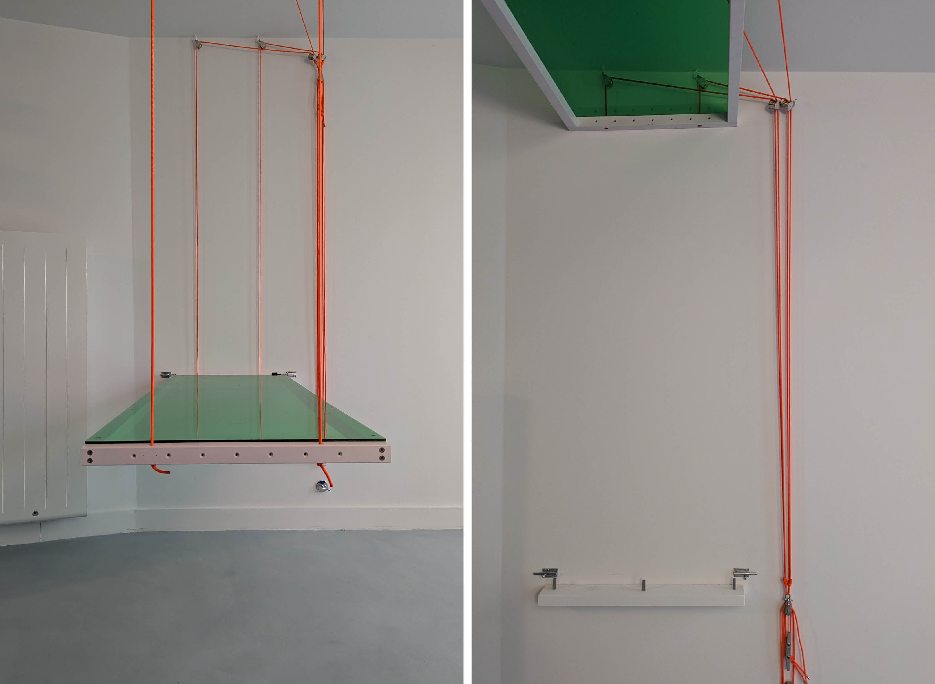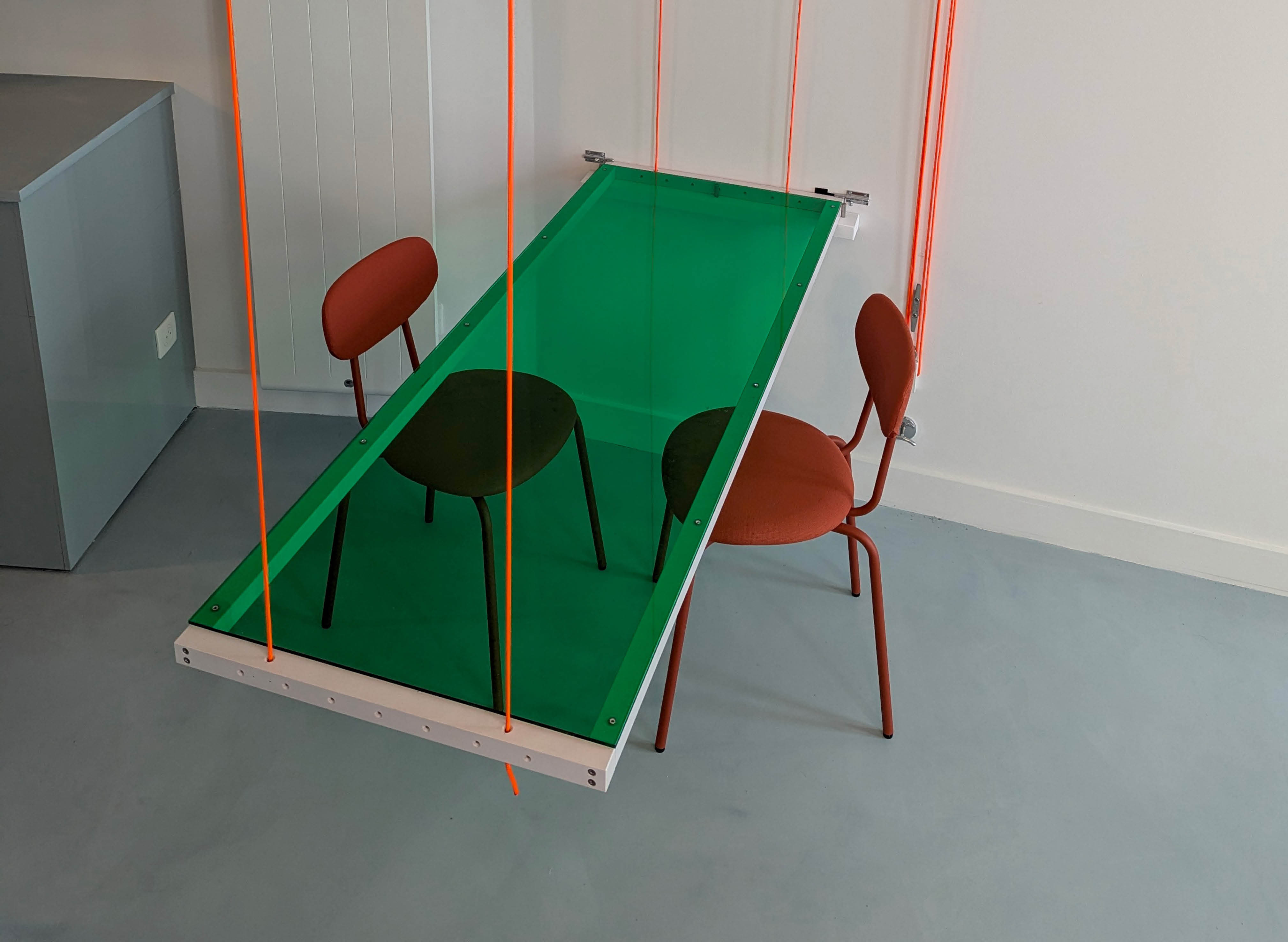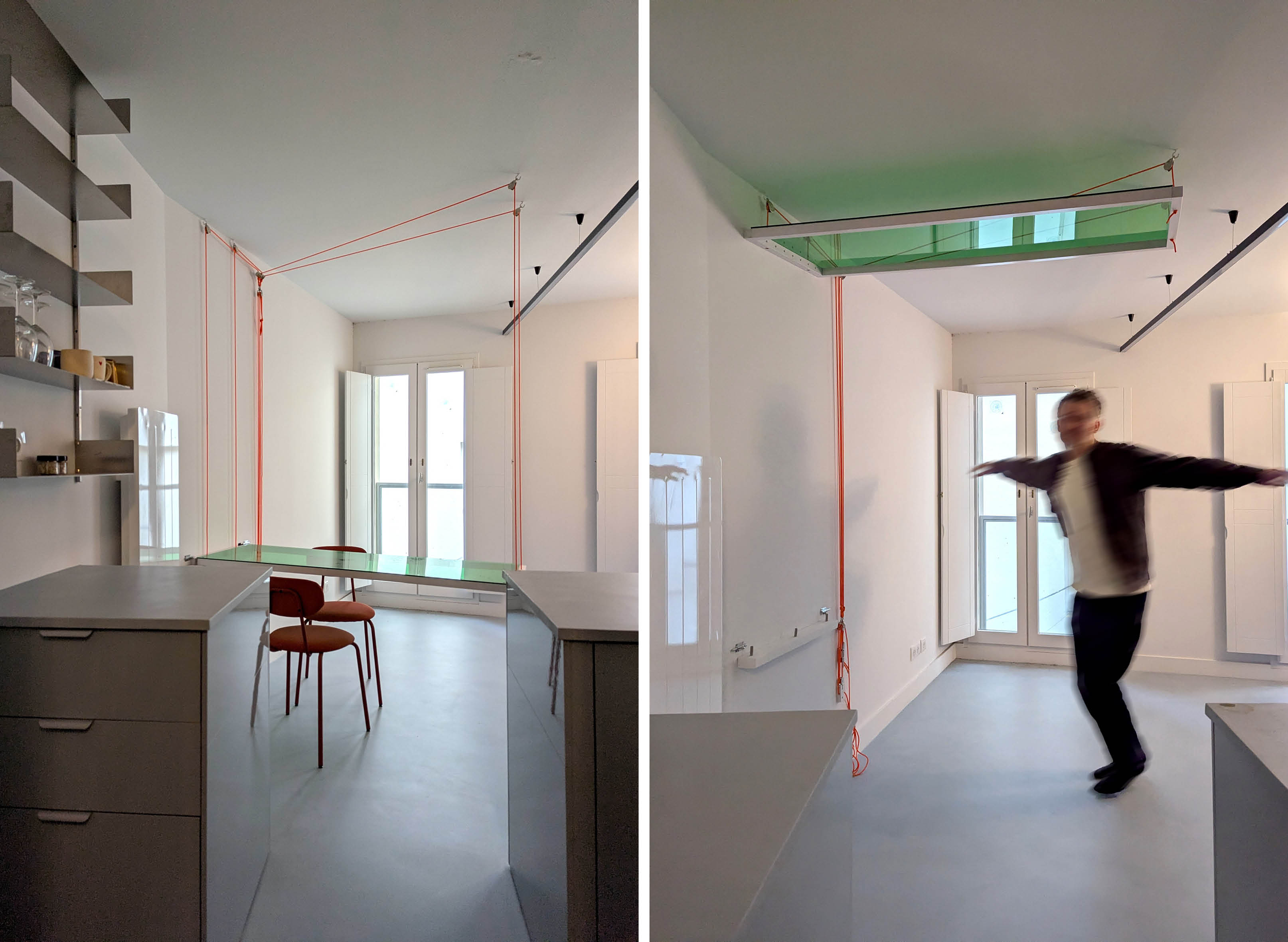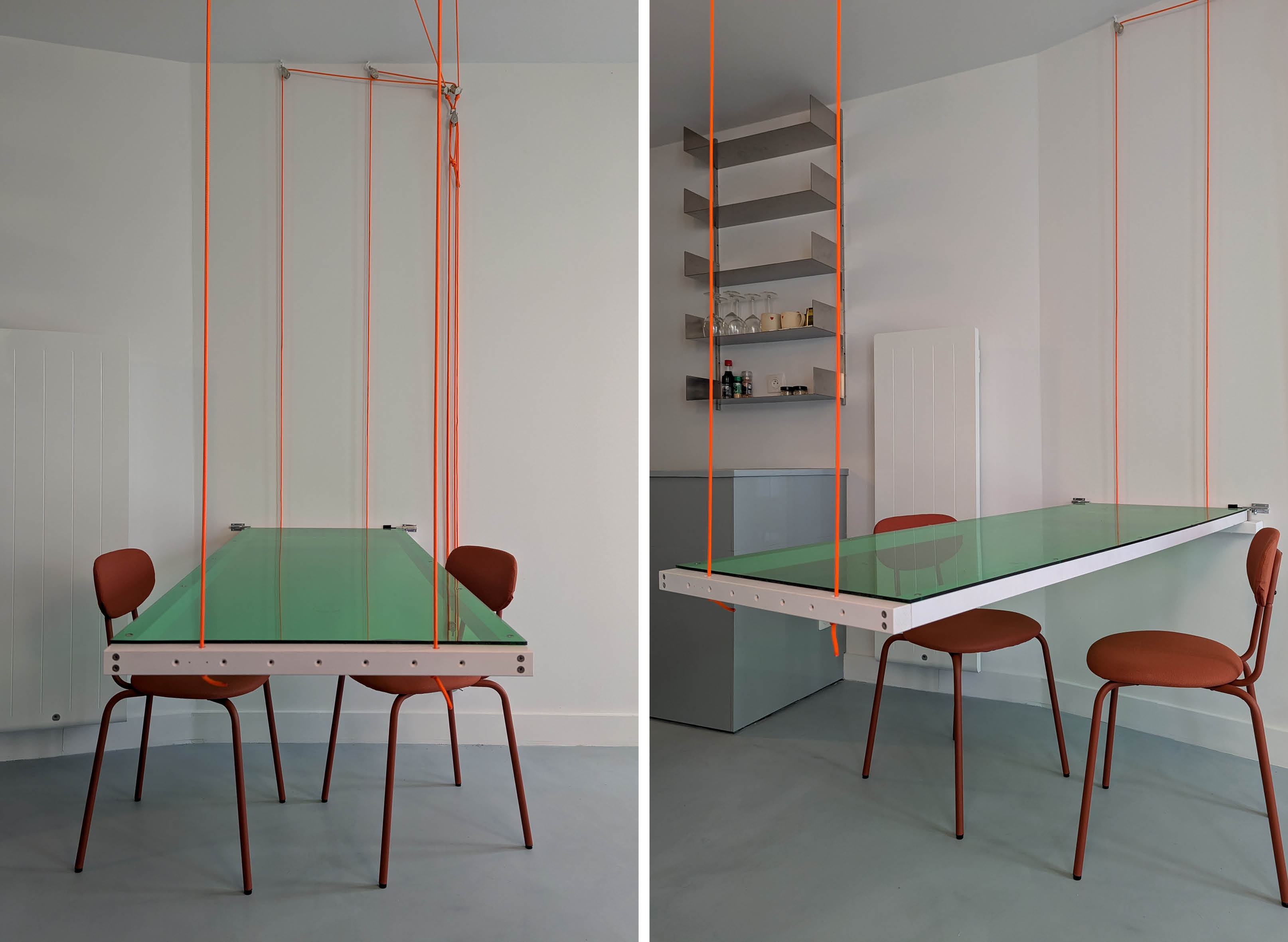 Cette table suspendue aux allures d'ovni participe à l’ultra-modularité : un espace dînatoire pour cinq personnes qui peut se métamorphoser, le temps venu, en piste de danse.